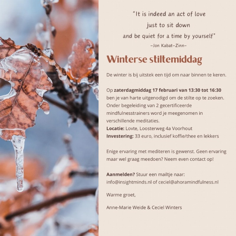 Op 17 februari organiseer ik samen met collega mindfulnesstrainer Ceciel Winters een stilte-/meditatiemiddag bij Lovte. Je wordt deze middag  begeleid in verschillende meditaties in een fijne omgeving.